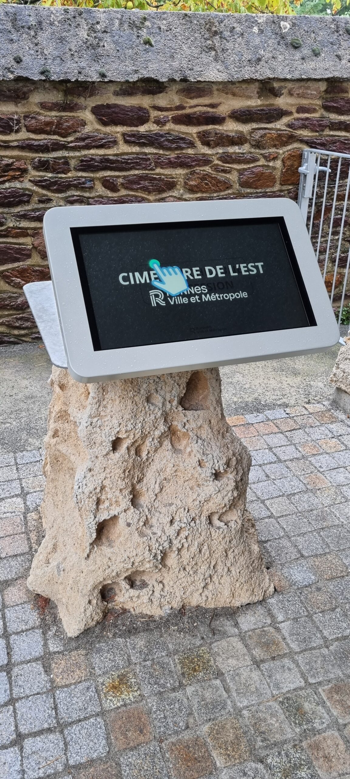 Nous avons installé une borne interactive au Cimetière de l’Est, à Rennes, pour accompagner les visiteurs dans leur parcours. Conçue pour être intuitive et accessible, elle permet de retrouver facilement les sépultures et de se repérer dans l’espace, rendant la visite plus facile et sereine.