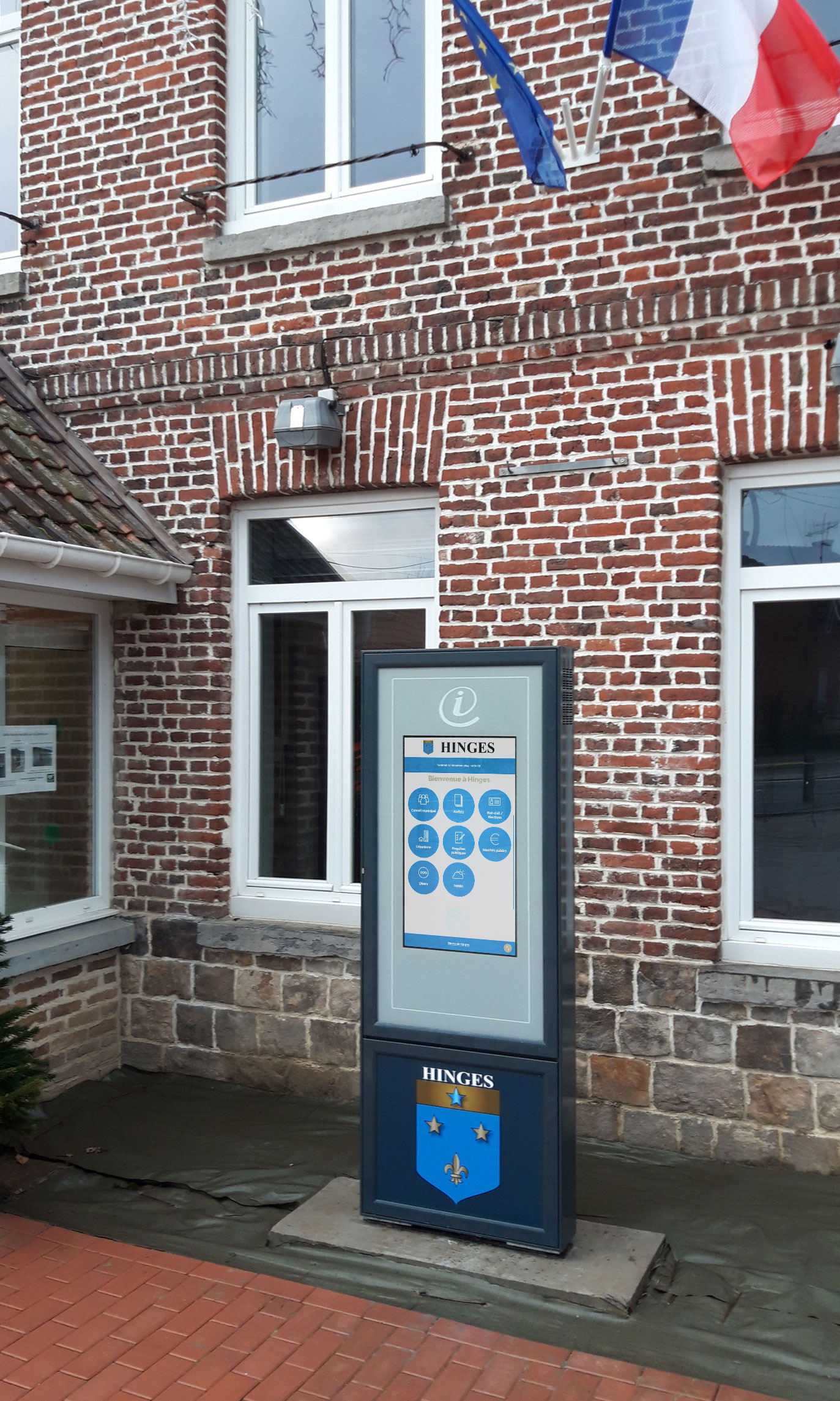 Pour moderniser sa communication, la mairie de Hinges (Pas-de-Calais) nous a fait confiance pour déployer son information municipale digitale. Deux bornes interactives ont ainsi été installés à des emplacements stratégiques afin de mieux informer les habitants.