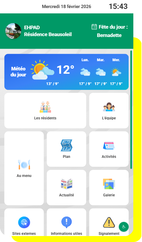 Les résidents bénéficient d’un outil visuel structurant qui leur permet de consulter les activités, les menus et les informations du jour. La mise en avant des événements favorise la participation et contribue à maintenir le lien social.